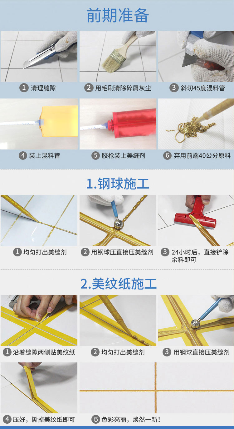 新装修的房子,如果没用瓷砖美缝剂,装修完后瓷砖缝隙总是看着脏兮兮的,时间久瓷砖缝就会变黑、甚至发霉,很影响美观,所以现在很多家庭在装修的时候都会选择做美缝,那么瓷砖美缝剂应该如何使用呢?