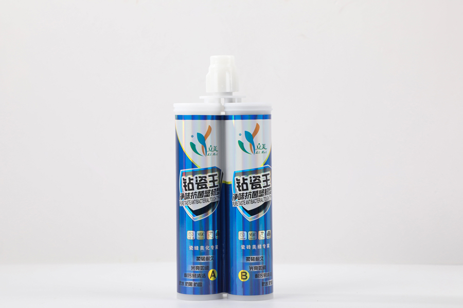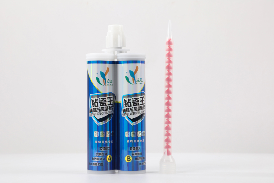 3.选择所要颜色的真瓷胶,装上专用混料管,套上专用胶枪,打缝时混料管尽可能与瓷砖面垂直。