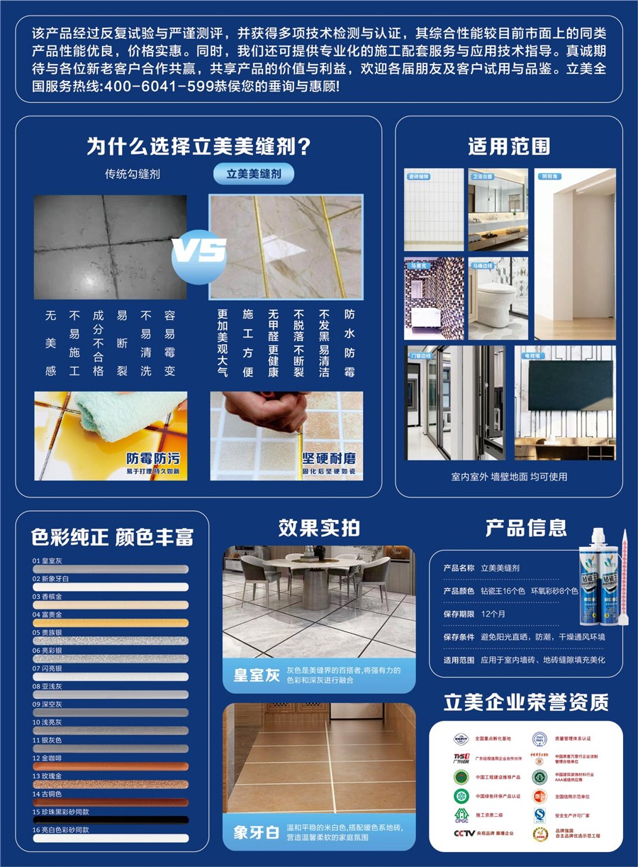 东莞立美瓷砖美缝事业部自成立以来,凭借技术和良好服务优势,缔造出一个又一个的优秀口碑!市场是最好的试金石,雄厚的技术力量,科学的管理方式,高素质的人才优势,可靠的商业信誉是广大客户选择立美美缝剂时不容置疑的前提。在未来的日子里,东莞立美瓷砖美缝事业部将凭借自身的经济实力和技术优势倡导新时代的环保建筑理念,以崇高的社会责任感和历史使命感,努力为中国建筑美缝事业前进发展作出应有的贡献!